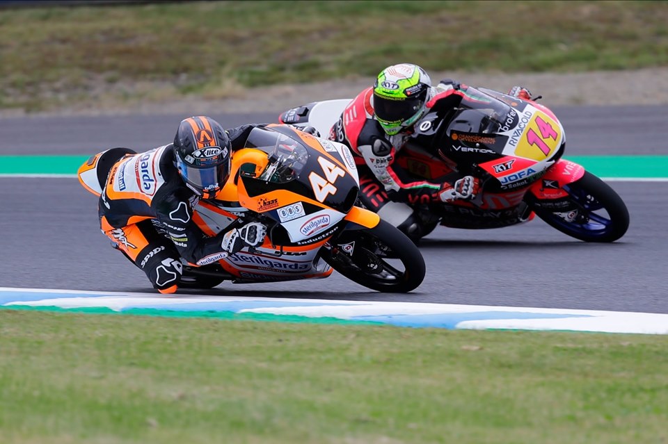 Arón, tras el cero en el GP de Tailandia, llega a Twin Ring Motegi, por lo que hemos podido ver hoy, con muchas ganas y marcando de cerca a su máximo rival en el campeonato. En esta primera jornada ha conseguido clasificarse duodécimo, por tanto y por el momento estaría clasificado directamente para la Q2 del Motul Grand Prix of Japan; ha establecido hoy un mejor tiempo de 1’57”195 quedándose 453 milésimas del mejor tiempo de.la jornada, pero a tan sólo 1 milésima de su principal rival por el título.