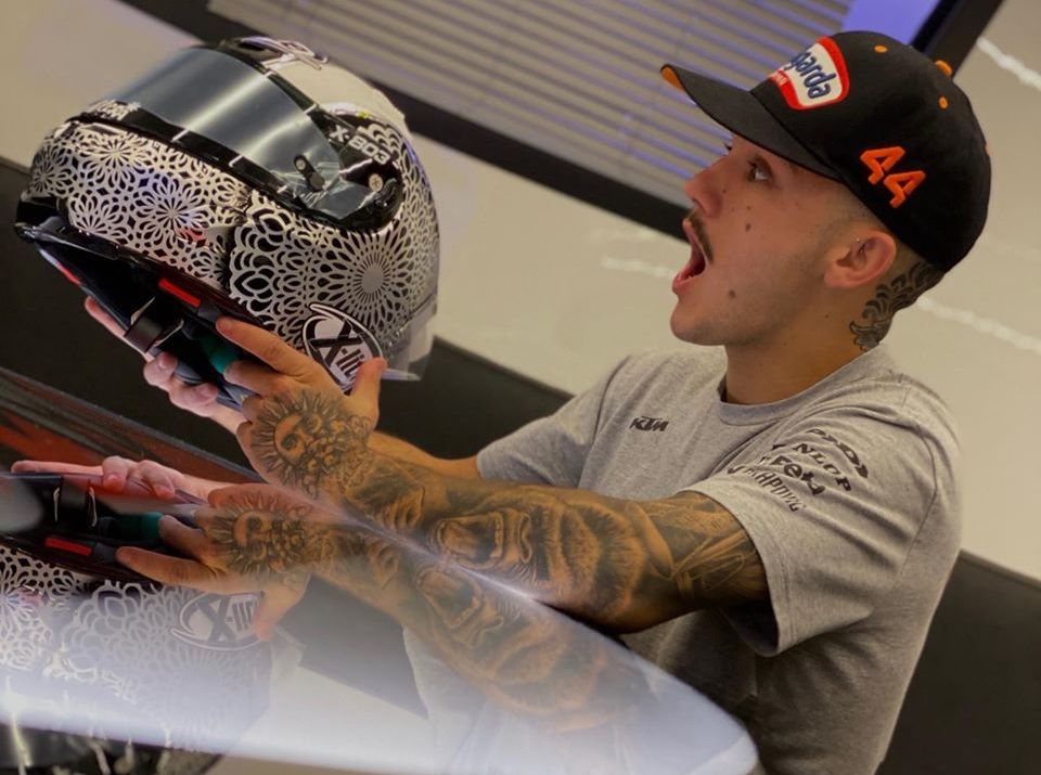 Como cada año cuando llega el Gran Premio de la Comunitat Velencina, Arón luce una decoración diferente a la que ha venido llevando durante toda la temporada. En esta ocasión, y como es un fanático de los tatuajes, su nueva decoración está en esa línea, todo su casco es como un tatuaje en blanco y negro y en algunas partes recuerda mucho al que lleva nuestro piloto en la nuca y parte trasera de su cabeza.