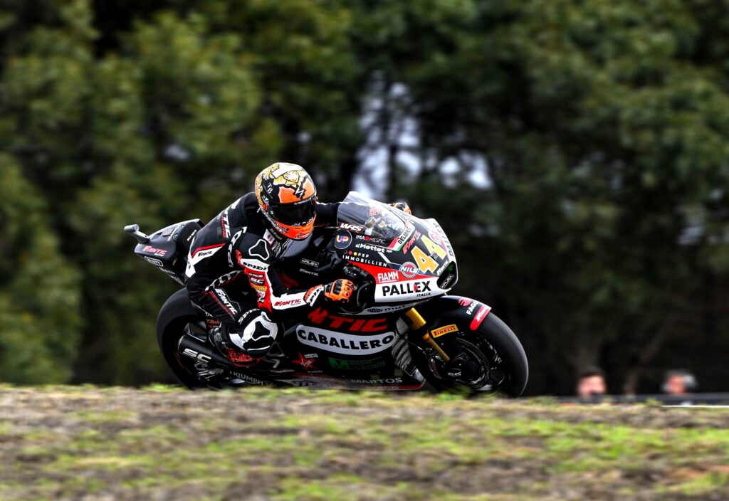 Por la mañana, 9:25 hora de Portimão –10:25 hora peninsular española– la FP2 se ha disputado con sol y paso de alguna nube alta, pero con el asfalto mojado consecuencia de la lluvia caída horas antes, por la noche; 16ºC en ambiente, 17ºC sobre el asfalto, viento de unos 5-6 km/h, y una humedad relativa del 75%, con estas condiciones Arón ha sido prudente, ha decidido no arriesgar, ha permanecido casi toda la sesión en el box, aunque finalmente sí que ha salido cuando faltaba un minuto para terminar la sesión, simplemente para probarse, comprobar la moto para que todo estuviera ‘en su sitio’, pero no ha llegado a marcar tiempo. Con todo, Arón ha concluido primero en la clasificación combinada de los libres con su registro de ayer, que fue de 1’41”460. Los tiempos por sectores nada relevantes, Arón sólo ha marcado tiempo en el T2 (14º) y T4 (15º).